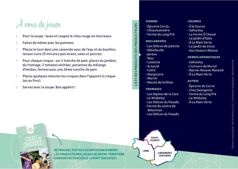 Sur le verso, vous trouverez la recette ainsi que la liste des produits à acheter chez les producteurs locaux.
